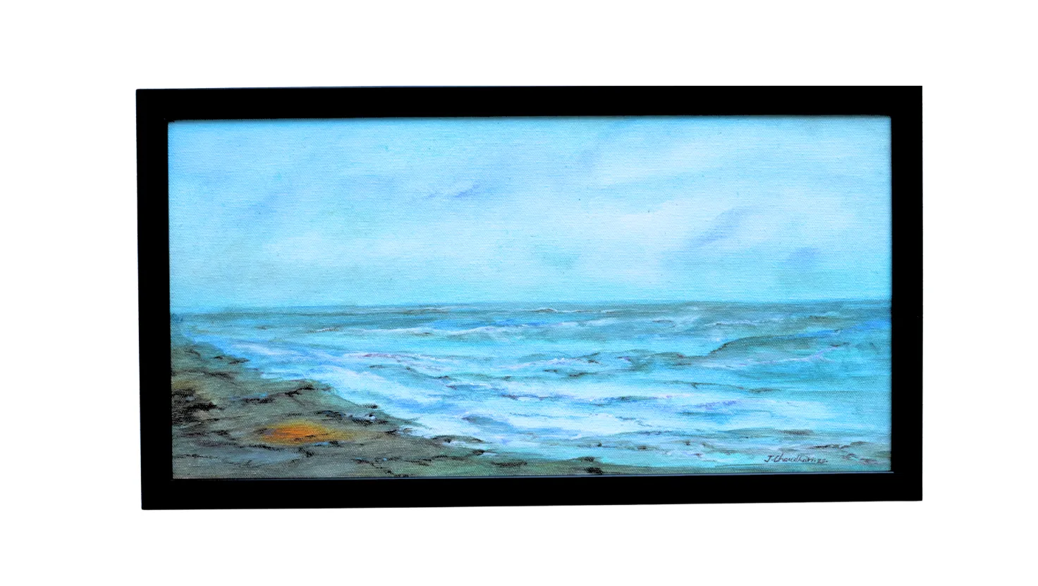 Azure Drift captures the gentle yet endless rhythm of the sea beneath a sky brushed with soft, muted blues. The waves roll in smooth, layered motions, their edges tinged with delicate foamy whites and hints of violet. Along the left side, a stretch of dark, earthy shoreline grounds the composition, contrasting against the expansive openness of the water. Subtle touches of warm ochre peek through, adding warmth to the otherwise cool palette. The sky feels calm and airy, painted with wisps of clouds that dissolve into the distance. The perspective draws the viewer’s eye far into the open sea, evoking a sense of quiet introspection. It’s a scene that invites stillness, letting one drift into the meditative lull of the ocean’s embrace.