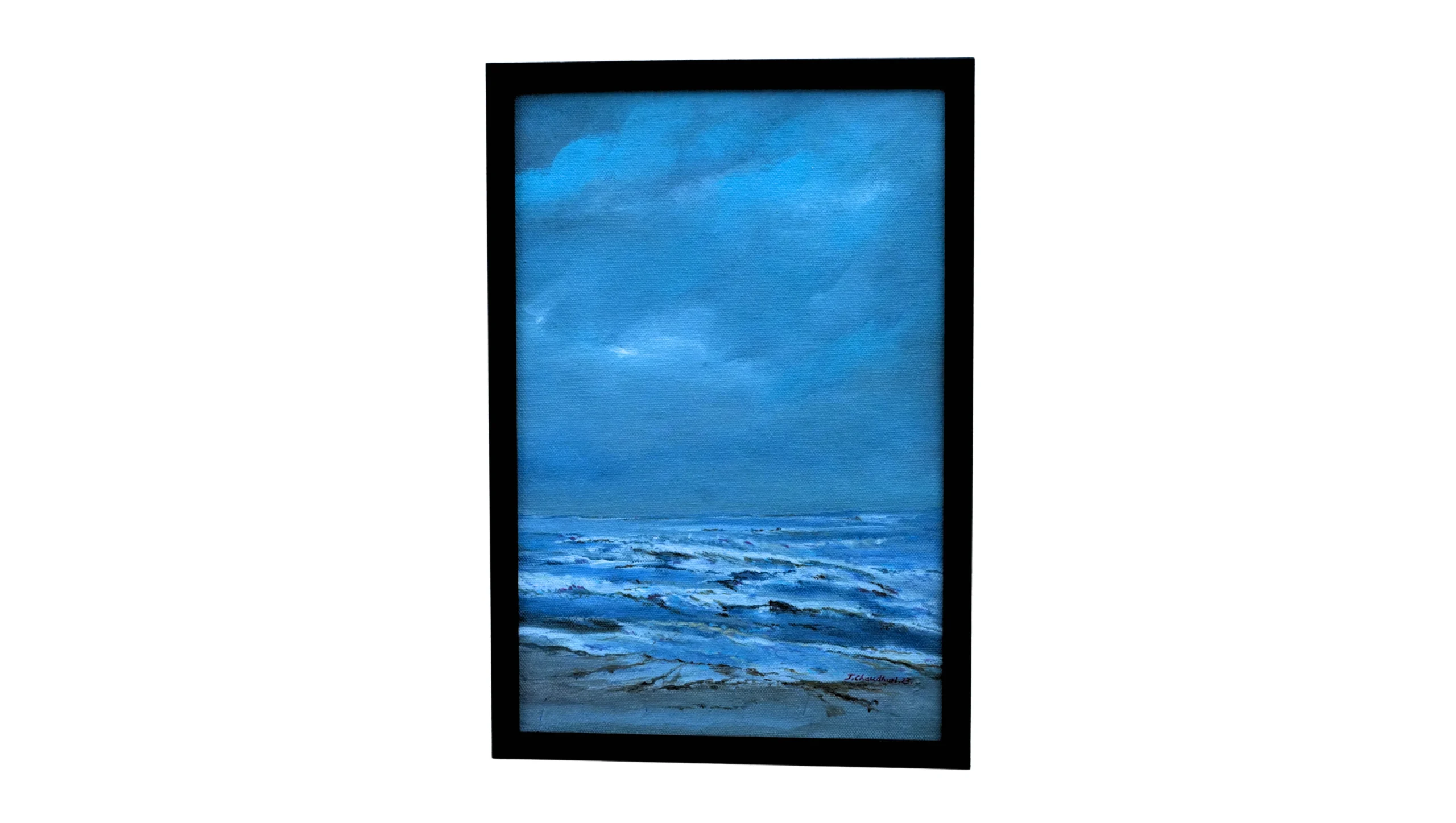 This painting evokes the serene vastness of an untouched seascape, where the deep blue waters merge seamlessly with the expansive sky. The left side captures textured waves, their movement suggested through layers of white, silver, and muted blue, breaking softly against a faint shoreline. The right side offers a calming openness, a smooth expanse of blue that draws the eye into infinite depth. Gentle shifts in tone create an almost meditative rhythm, reminiscent of watching the ocean under a quiet sky. The minimalistic composition allows the viewer to feel both solitude and boundless freedom. Subtle brushstrokes suggest light and motion, while the cool palette wraps the scene in tranquility. It is a visual breath—refreshing, infinite, and timeless.