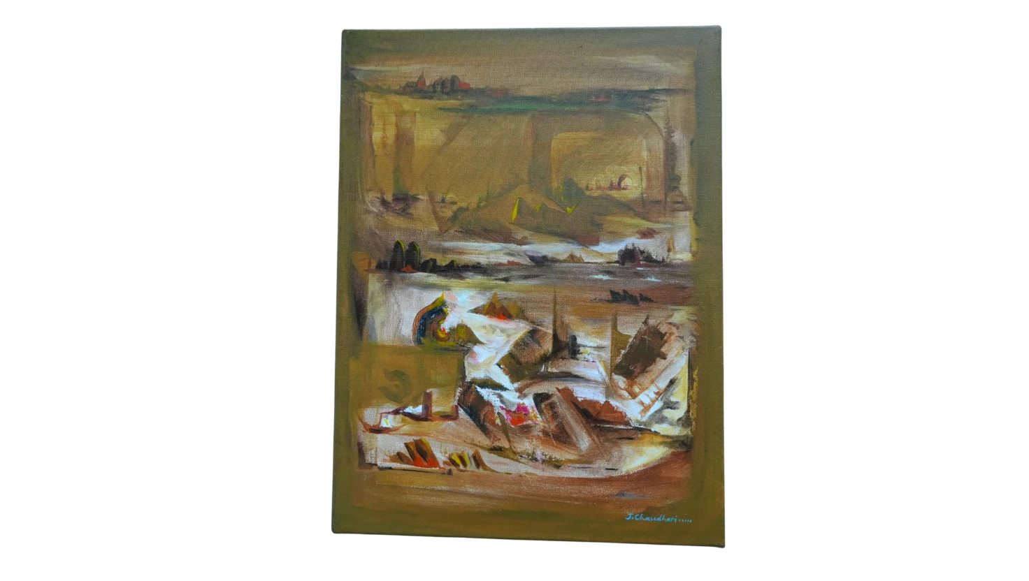 This abstract painting unfolds in rich shades of gold, ochre, and earthy browns, creating an atmosphere both warm and enigmatic. On the left, loosely defined human-like forms emerge from bold, sweeping brushstrokes, their postures suggesting interaction or contemplation. White and crimson accents break through the golden hues, adding sparks of vibrancy and emotional contrast. The right side is more subdued, filled with layered tones and subtle textures, evoking depth and distance. Vertical and diagonal strokes weave through the composition, lending a sense of movement and narrative without explicit detail. The interplay between defined shapes and blurred edges draws the viewer in, inviting personal interpretation. It’s a work that feels like a moment frozen between memory and dream, where figures live in the timeless glow of an eternal sunset.