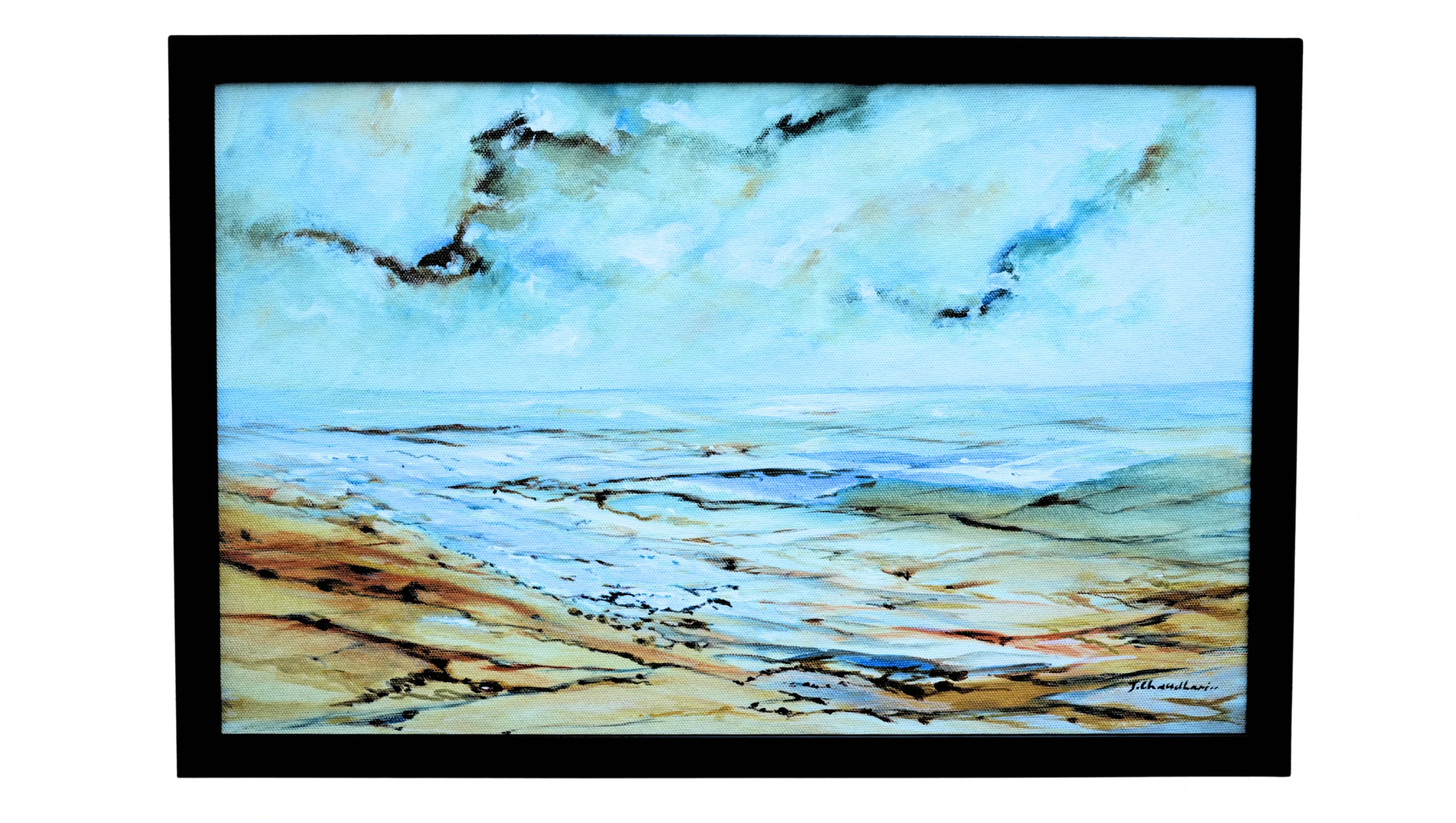 This landscape painting captures the tranquil meeting of earth, water, and sky under a vast expanse of moving clouds. The foreground glows with warm ochre and sienna tones, leading the viewer’s gaze toward the gentle blues of the distant horizon. Subtle brushstrokes depict ripples and flowing currents, evoking the calm rhythm of nature. The sky is alive with soft cloud formations, tinged with hints of turquoise, cream, and muted green, suggesting a moment before or after a coastal rain. The transition between land and sea is blurred, creating a poetic sense of infinity. The piece radiates serenity while carrying a quiet, introspective depth. It invites the viewer to pause, breathe, and lose themselves in the boundless horizon.