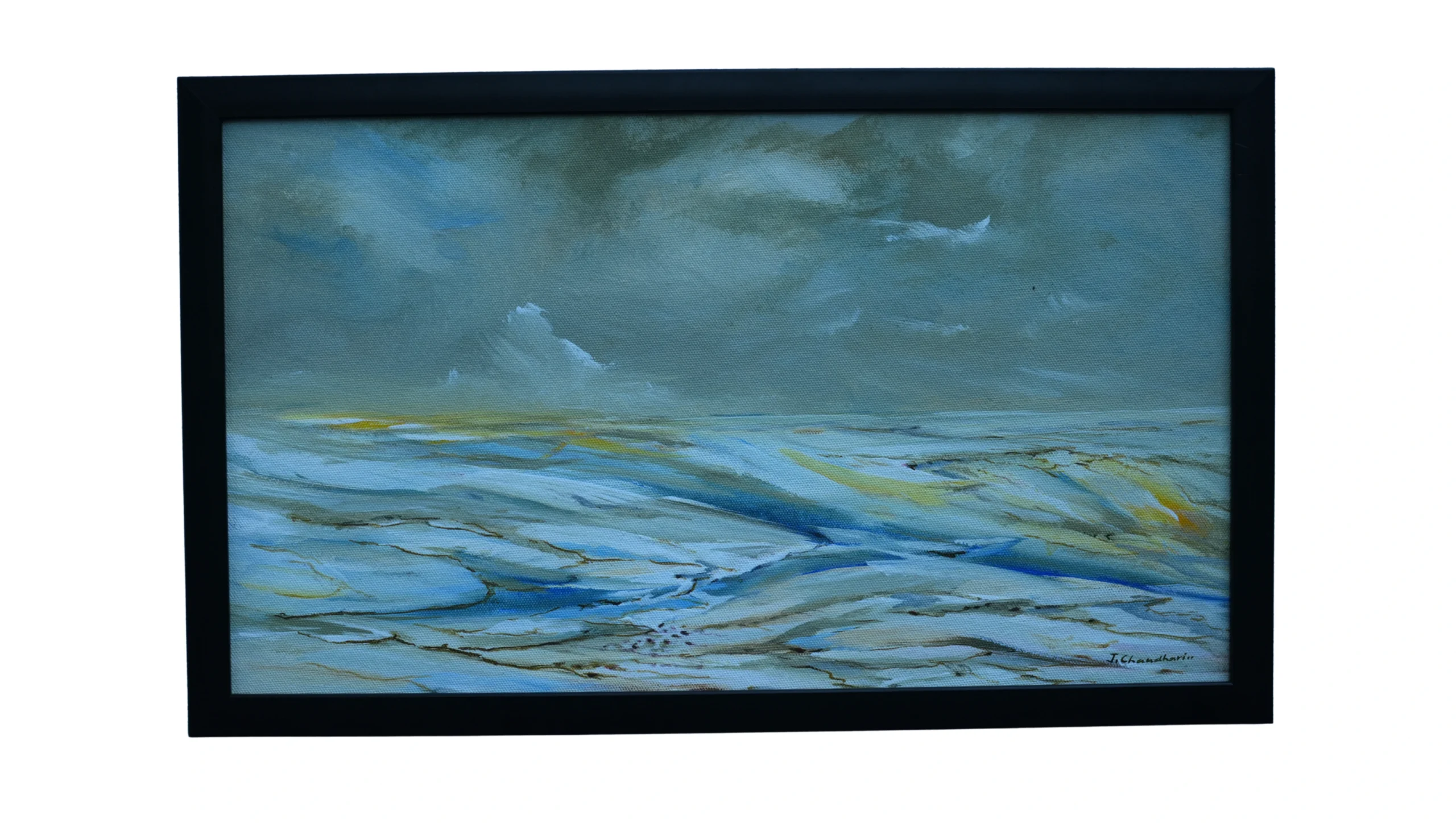 This serene landscape captures the quiet majesty of a vast, snow-covered expanse stretching endlessly into the distance. Delicate strokes of white, pale blue, and soft yellow create a sense of light reflecting off icy plains. The sky, painted in muted greys and greens, hints at an overcast day, where the sun hides behind a thick blanket of clouds. Subtle golden accents along the horizon suggest the faint warmth of daylight struggling to pierce the chill. The gentle flow of lines in the snow evokes the movement of wind over the frozen surface. The composition carries an almost meditative stillness, drawing the viewer into its calm, unbroken space. It’s a poetic tribute to the beauty and solitude of winter’s untouched landscapes.