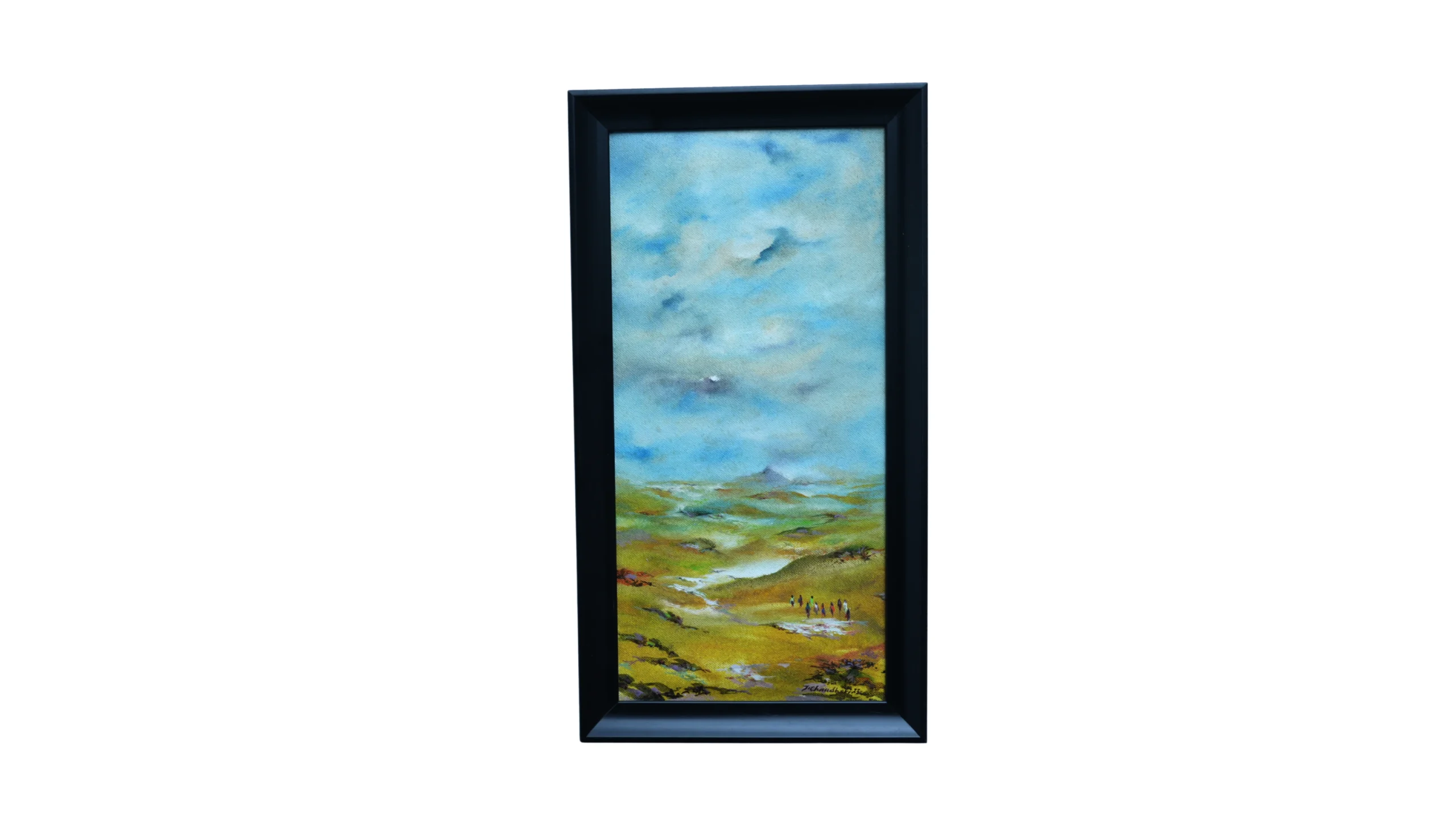 This painting captures the meeting point of lush earth and the expansive sky, where rolling green fields gently fade into misty blues. The left side bursts with earthy tones of olive, moss, and ochre, textured to convey the rugged charm of untouched terrain. Small figures, scattered in the landscape, offer a sense of scale and human presence amidst the vastness. The right half opens into a dreamy, cloud-laden sky, soft and diffuse, lending balance to the grounded richness of the land. Strokes are fluid yet deliberate, blending hues seamlessly while retaining an organic spontaneity. There’s a quiet tension between the solid ground and the shifting heavens, making the viewer pause. Verdant Veil is both a celebration of nature’s fertility and a meditation on its delicate impermanence.