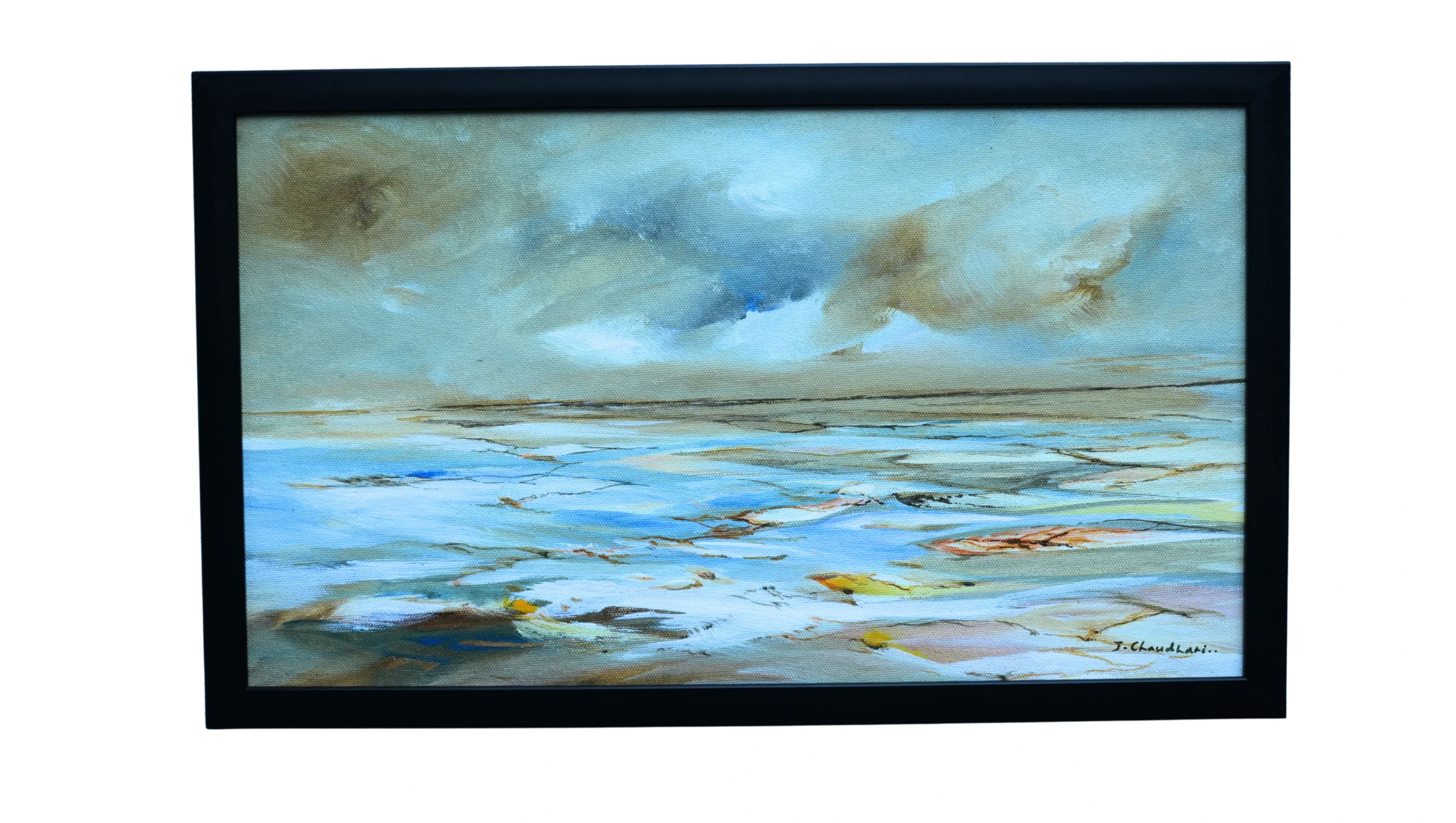 This landscape painting captures the calm anticipation that lingers before a rainstorm sweeps across the land. The sky, painted in muted shades of beige, olive, and soft grey, swirls with heavy clouds that seem ready to release their weight. Below, a vast expanse stretches into the horizon, its surface a mosaic of cool blues, warm golds, and earthy browns, reminiscent of waterlogged fields or tidal flats. Gentle cracks and flowing lines in the composition suggest movement beneath the stillness, as though the earth itself is breathing in preparation. The horizon is faint yet steady, anchoring the scene in quiet balance. Light touches of brighter yellow and orange glimmer through, hinting at the sun’s last defiance before being swallowed by the storm. It is a portrait of nature’s quiet pause—fragile, tense, and beautiful.